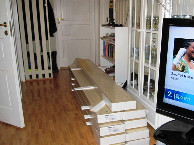 bildene er kjøkkeninventar og utstyr spredt rundt i stuedelen, men det går helt greit, fordi diverse saker fra stua er midlertidig flyttet opp på loftet. Ellers hadde ho mor og jeg tenkt oss på kino i kveld, men vi måtte droppe det da vi følte oss så sliten. Vi får heller ta det igjen en annen kveld…
