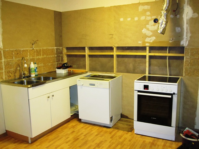 Her i Kvartsveien 19 skrider opp-pussingsarbeidet fram, dog ikke så veldig fort. En av årsakene til dette er at kjøkkenleverandøren, IKEA på Slependen i Oslo, leverer sine varer i to porsjoner med ei ukes mellomrom. Første leveranse, det meste av kjøkkenet, leveres onsdag den 6., mens benkeplatene og diverse annet småtteri leveres først onsdag, 13. april, på mor sin gebursdag. I tillegg er det slik at parkettgulvet som skal pryde opp i kjøkken og stue, må ligge til tørking i ca. 5 dager før det er klart til legging. Det betyr at ferdigstillelse av kjøkkenet drar ut i tid slik at det ikke er nødvendig å stresse for å bli ferdig med rivinga av det gamle. På den andre sida er vi jo heller ikke så unge og spreke lenger, så det begrenser seg hvor mye vi klarer å utføre, etter jobb. Siden vi ikke kan bli ferdig før tidligst om to uker fra nå, og er avhengige av vann til både oppvaskmaskin, vasking og matlaging, kan vi heller ikke få gjort nødvendig rørleggerarbeid. Når det gjelder det elektriske er det også her snakk om en del omlegginger, spesielt i forhold til ventilatoravtrekk fra kjøkken, bad og vaskerom. Heldigvis har vi en lokal elektrikervenn som kan bistå oss i dette arbeidet. Den føromtalte EL-sjekken medførte dessverre uventede utgifter. På en av kursene i kjelleren ble det konstatert jordingsfeil, som må lokaliseres og utbedres. Som dere kan se av illustrasjonsbildet så er en del av sponplatene på veggene fjernet. Årsaken til dette er at det var umulig å fjerne de gamle flisene ved bruk av hammer, meisel og annet spesialutstyr. Ubehandlete sponplater har medført at fliselimet som er brukt hadde trukket såpass langt inn i platene at det ble lite igjen av platene bak. Noen steder ble det også store åpne områder når flisene ble fjernet. I tillegg var arbeidet med å fjerne flisene såpass krevende at løsningen ble å sage ut hele de flisbelagte platestykkene. Det gjenstår nå å felle inn nye plater som igjen skal dekkes av flislignende plater som er beregnet for kjøkken. Sjøl om vi har støtt på en del uforutsette utfordringer så langt, tror og håper vi at resultatet blir bra til slutt…