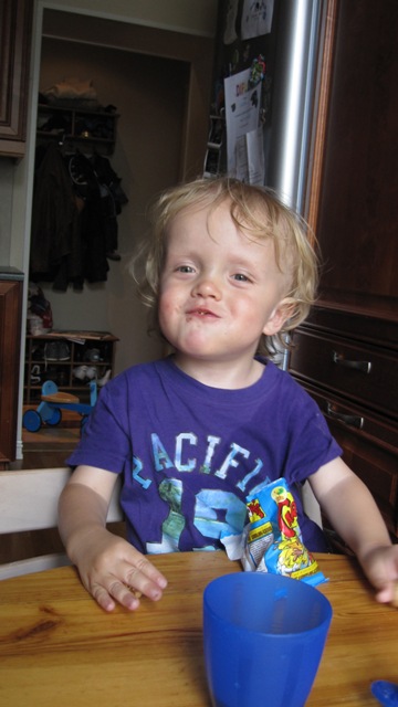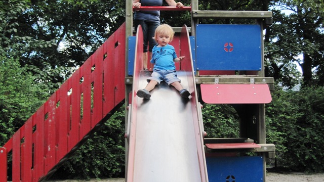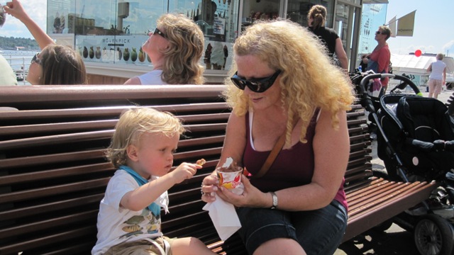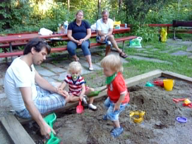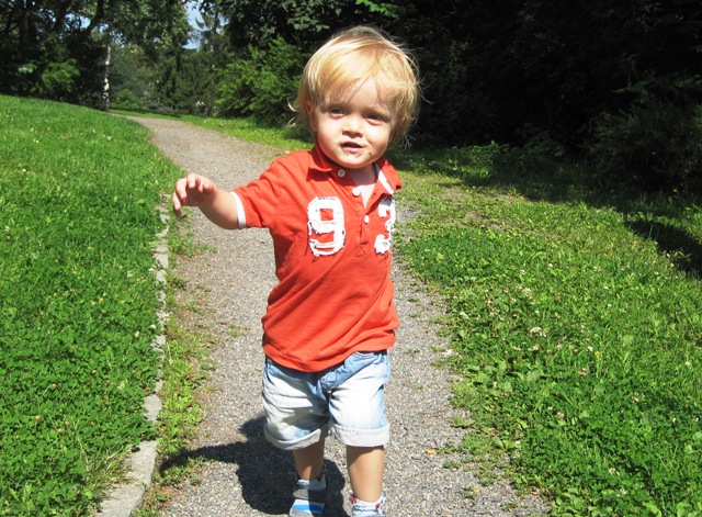 Da er det vel på tide med en liten epistel fra oss som tilbringer dagene som barnevakt i Oslo. I morgen kommer Steinar og Anja hjem fra Bosnia, og oppdraget som barnepassere for Victor er over for denne gang, et oppdrag som har gått over all forventning. Vi ankom Tigerstaden på kvelden sist mandag, og Steinar hentet oss på Gardermoen. Stine og Arild var kommet tidligere på ettermiddagen, og Anja dro også samme dag til Bosnia sammen med venninna si. Til tross for at hele nasjonen er i sjokk etter de tragiske hendelsene med bombeangrepet i regjeringskvartalet og skytedramaet på Utøya fredag i forrige uke, fikk vi 2 fine dager sammen her i Oslo, før Arild og Stine reiste på ei ukes ferie til Kreta. Steinar reiste til Bosnia på torsdag, og siden da har han Victor, ho mor og jeg kost oss her i hovedstaden. Vi har hatt et nydelig vær med sol fra skyfri himmel og temperaturer opp mot 30-tallet. Av og til har det vært torden og regn, men stort sett har vi vært innendørs i de verste skyllene. På fredag fikk vi oss ei ordentlig skyllebøtte og ble våte til skinnet før vi nådde oss i hus, men vi «sto han av» for regnet var nesten som en varm og deilig dusj. Onsdag ettermiddag var vi på besøk hos Eva og lille Aurora (jenta som var med på bryllupsfesten), der vi fikk servert nydelig grillmat og deilige, hjemmelagede salater. Det var kjempekoselig å treffe dem igjen og vi var der i flere timer. Vi har også trasket rundt i byen, vært på Aker brygge, ved slottet, i parker, vært på lekeplasser og disset og rutsjet, og også tilbrakt mye tid ute i bakgården her vi bor. Det har også blitt tid til å spise en is, eller flere, og pølse med lompe har heller ikke vært å forakte. Men kostholdet har sjølsagt også inneholdt skiver med leverpostei og annen sunn mat. Det er fantastisk å oppleve at han er så tillitsfull og slår seg så godt til ro i lag med oss. Det har faktisk ikke vært noe skriking og masing. Mon tro om han synes vi er like attraktive når han får foreldrene hjem i morgen…